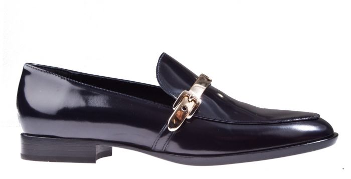Attilio Giusti Leombruni D 714074 blauw leer moccasin. Elegante mocassin in zwart glanzend leer van AGL. De high fashion instapper heeft een stijlvolle uitstraling. Er zit een leren metalic bronzen leren bandje over de wreef.